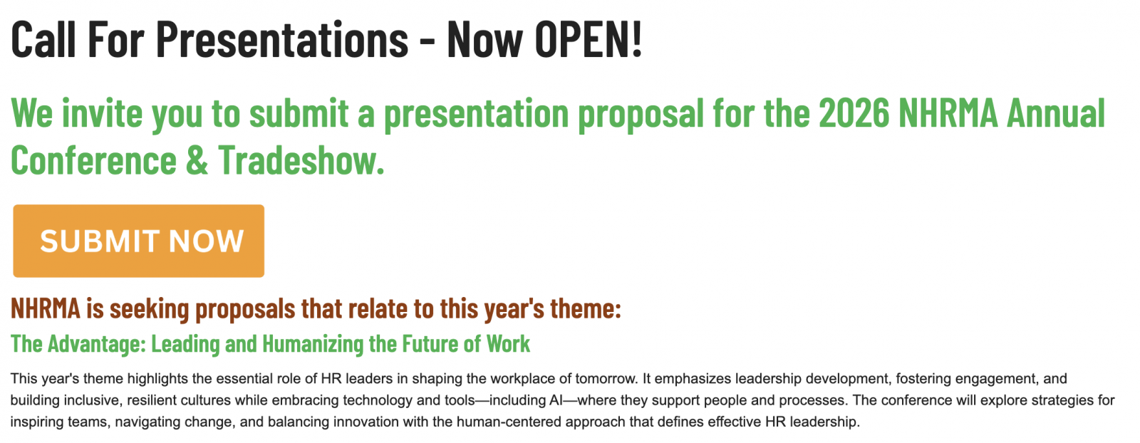 Before the new year's calendar is full of appointments and deadlines, take a minute to consider how you might serve your profession through a presentation at the 2026 NHRMA Conference. Submit your speaker's proposal by February 6, 2026.